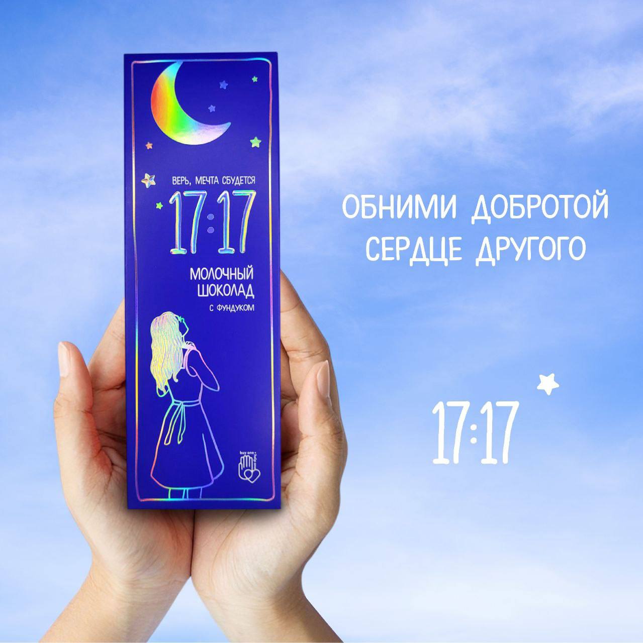 При покупке шоколада в фирменных магазинах 17:17 каждый покупатель получает в подарок шоколад – не для себя, а для другого человека, которого необходимо обнять добротой и подарить ему веру в мечту.